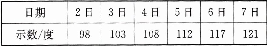 1. [2024朔州模拟]小明家在五月下旬搬进了新房,为了解六月份的用电情况,他在六月份连续几天的同一时刻记录电表的示数,如下表: