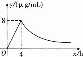 5. 某药品研究所开发一种抗菌新药,经多年动物实验,首次用于临床人体试验,测得成人服药后血液中药物浓度 $ y $(μg/mL)与服药时间 $ x $(h)之间函数关系如图所示,则血液中药物浓度不低于 $ 4 $ μg/mL 的持续时间为(