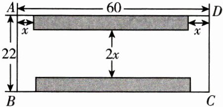 7. [2024 西宁]如图,小区物业规划在一个长 60 m,宽 22 m 的矩形场地 ABCD 上,修建一个小型停车场,阴影部分为停车位所在区域,两侧是宽 x m 的道路,中间是宽 2x m 的道路. 如果阴影部分的总面积是 $600 m^{2}$,那么 x 满足的方程是 (