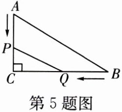 5. 如图,在 $Rt\triangle ABC$ 中,$\angle C = 90^{\circ}$,$AC = 12$ $cm$,$BC = 16$ $cm$。点 $P$,$Q$ 分别从点 $A$,$B$ 出发沿 $AC$,$BC$ 方向向终点 $C$ 匀速运动,其速度均为 2 cm/s。设运动时间为 $t$ $s$,则当$\triangle PCQ$ 的面积是$\triangle ABC$ 的面积的一半时,$t$ 的值为(