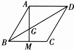4. 如图,四边形$ABCD$是菱形,$M$是$BC$上一点,连接$AM$交对角线$BD$于点$G$,且$\angle ABC = 2\angle BAM$。