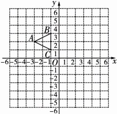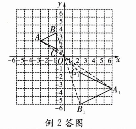 例2 在如图所示的平面直角坐标系中,$\triangle ABC$的三个顶点坐标分别为$A(-3,2)$,$B(-1,3)$,$C(-1,1)$,以坐标原点$O$为位似中心,在$x$轴下方,画出$\triangle ABC$的位似图形$\triangle A_{1}B_{1}C_{1}$,使它与$\triangle ABC$的相似比为$2:1$.