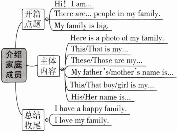 Step 3连——连词成句 2.a photo of father’s name His name;Step 5修——修饰美化 1.In their free time, they like gardening. They grow lots of flowers in their yard. 2.Both of my parents are teachers. They like running at night, so they are very healthy. 3.I like him best because he is very cute and smart. He has a round face with bright eyes. 4.I love my family very much, and we love each other deep down in our hearts.
