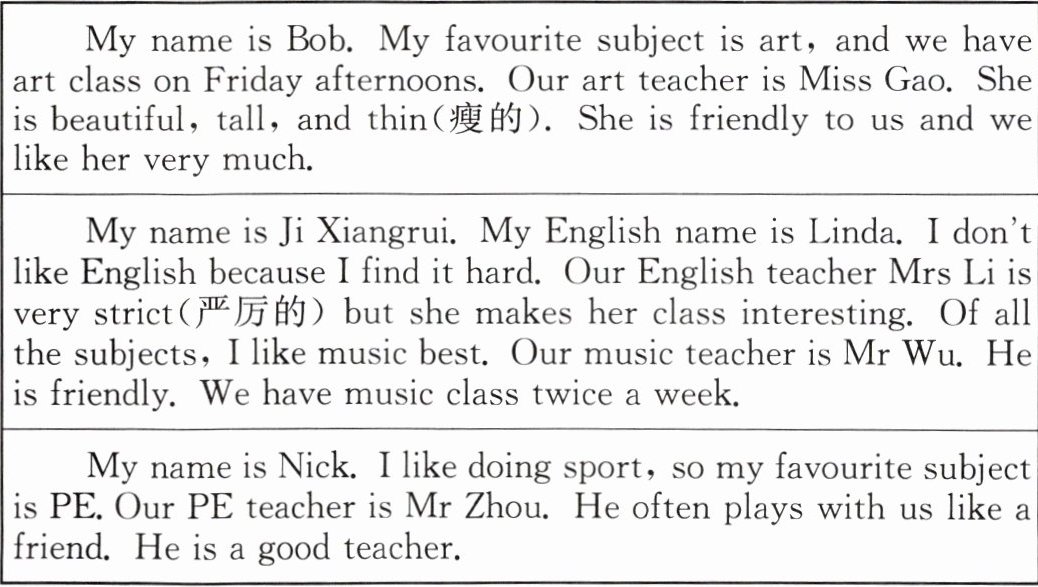 )3. What does this passage mainly talk about?A. Three students' favourite subjects.