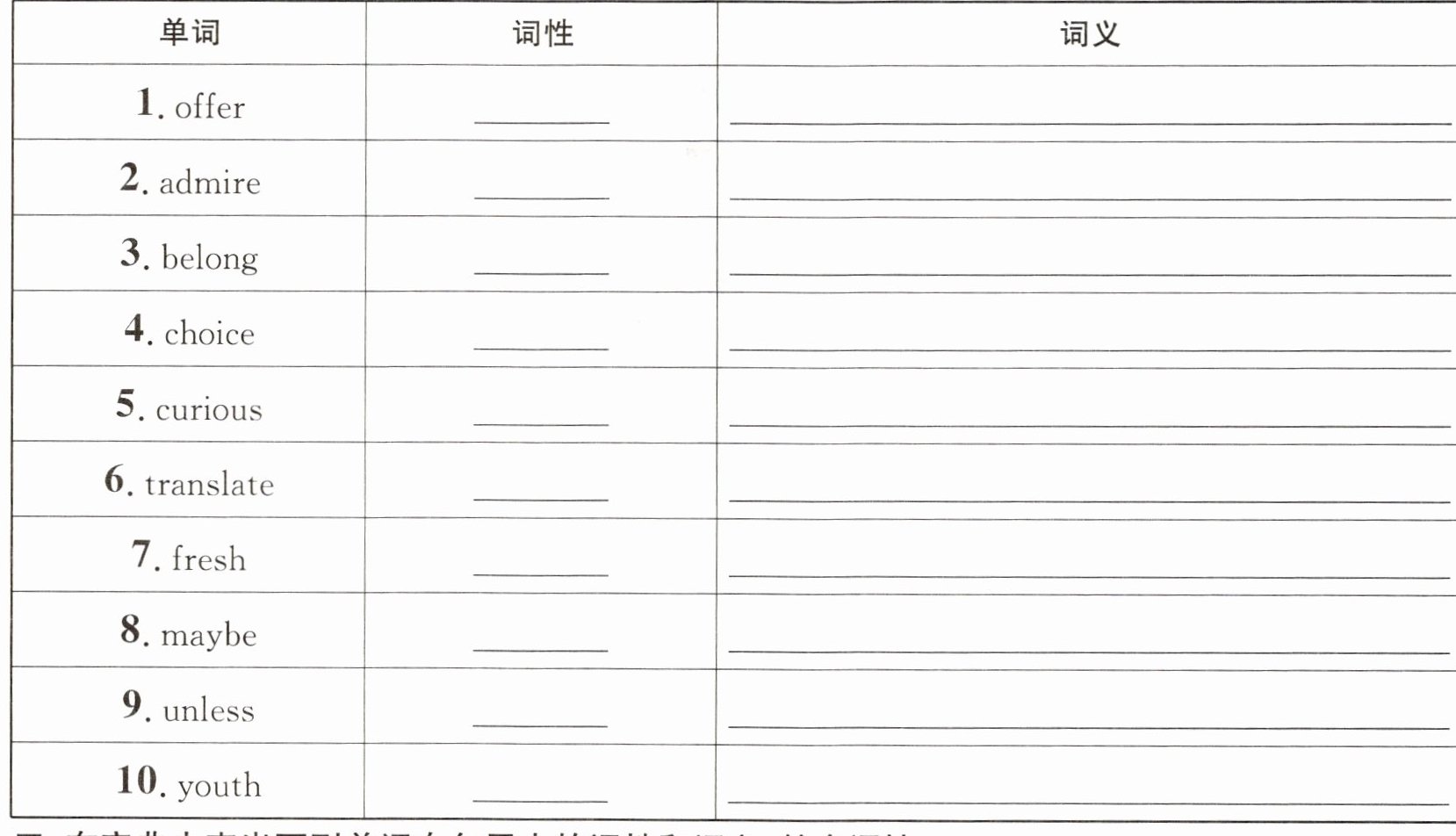 二、以最快的速度在字典中找到这些单词,并写出这些单词的词性和词义