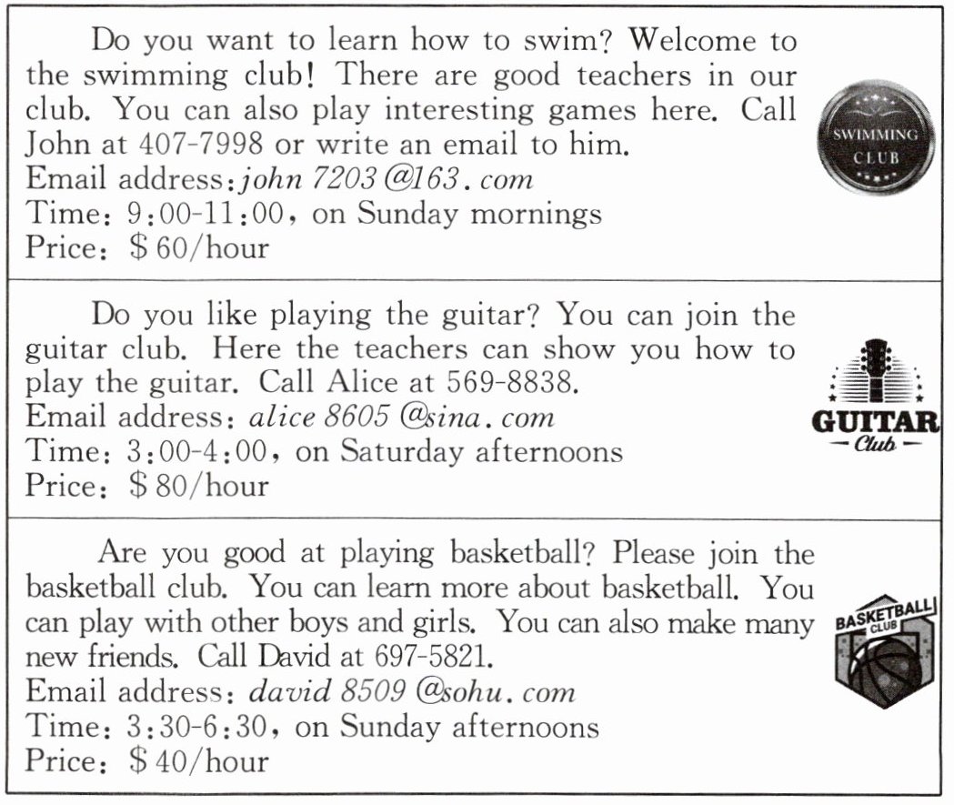 )1. Which number can you call to join the basketball club?A. 407-7998. B. 569-8838. C. 697-5821.