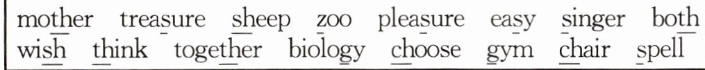 六、1. /s/ singer; spell 2. /z/ zoo; easy 3. /ʃ/ sheep; wish 4. /ʒ/ treasure; pleasure 5. /tʃ/ choose; chair 6. /dʒ/ biology; gym 7. /θ/ think; both 8. /ð/ mother; together