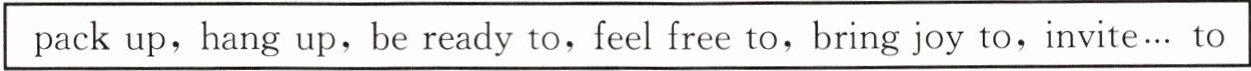 1.hang up 2.bring joy to 3.invited to 4.feel free to 5.packed up 6.is ready to