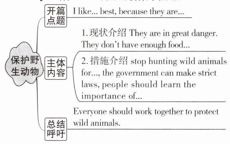 2. 主体内容:However, these big cats are ____ ____(处于极大的危险之中)now. They don't have ____ ____(足够的食物)to eat, and their living areas are becoming smaller and smaller. ____ ____(以下是)my advice. First of all, ____ ____(停止猎杀)wild animals for getting their fur, skin, teeth, or meat. Besides, the government can ____ ____ ____(制定严格的法律). Last but not least, people should learn ____ ____ ____(……的重要性)protecting wild animals.