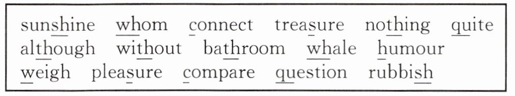 1. whom; humour 2. whale; weigh 3. nothing; bathroom 4. although; without 5. connect; compare 6. quite; question 7. sunshine; rubbish 8. treasure; pleasure