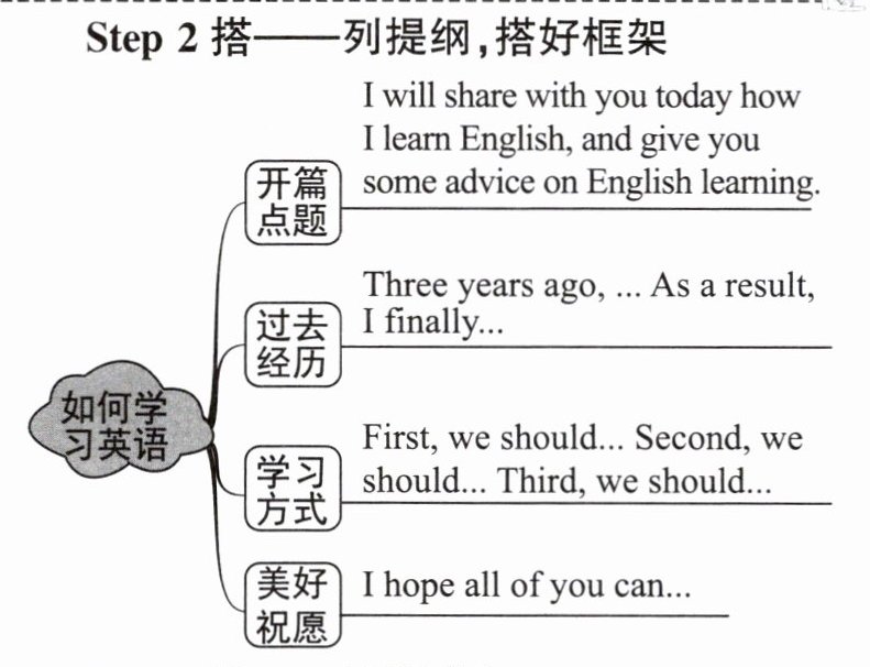 Step 3 2.had difficulty in learning English As a result be afraid of 3.All in all Step 5 1.It was difficult for me to memorize so many words and understand what people were saying. 2.I have some suggestions about how we can learn English well. 3.Second, we should speak English as much as possible in class.