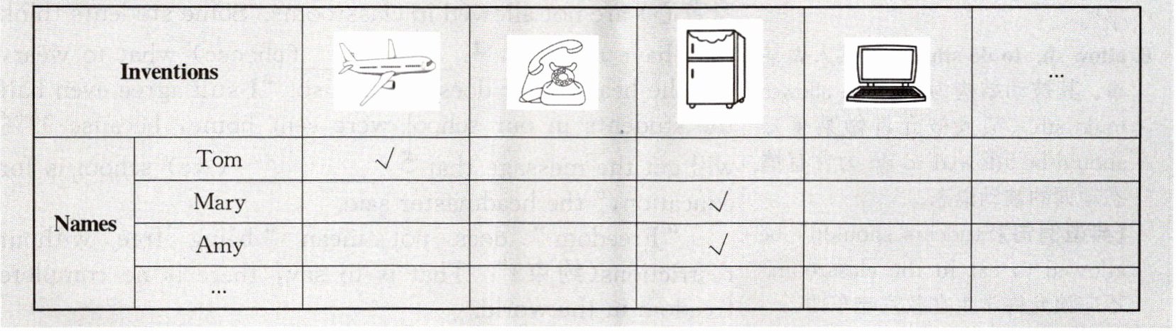 2. 人类的发明创造促进了科学技术和人类文明的进步,提高了人们的生活水平,使我们享受到许多科技进步所带来的好处。请你根据以下表格内容对你班的同学做一个调查,了解他们认为最有影响力的发明是什么。