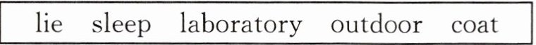 1.sleepy 2.outdoors 3.coat 4.laboratories 5.lay