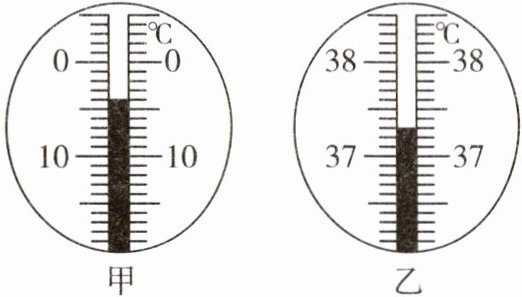 (选填“高于”“低于”或“等于”)$10\ ^{\circ}C$,对温度反应更灵敏的温度计是乙