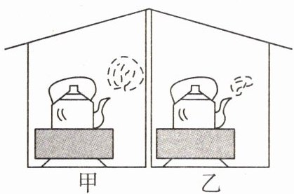 9. 如图,两个相同的水壶内装有同样多的水,此时都已沸腾。已知液化气炉火的强度和房间内空气的湿度都相同,因此可以判断出:房间甲的气温