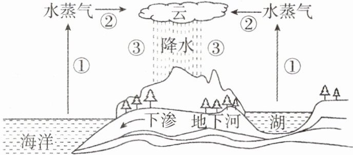 7. 如图所示是水循环示意图,水循环是指地球上各种形态的水,在太阳辐射、地球引力等作用下,不断进行周而复始的运动过程。