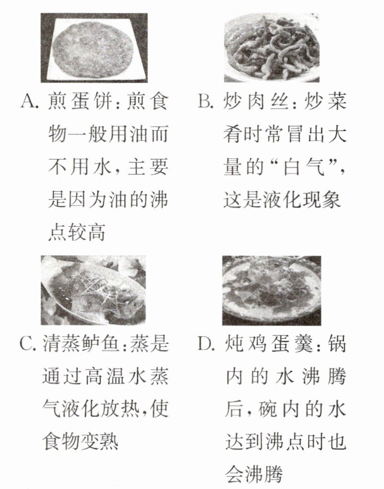 5. 煎、炒、蒸、炖是常用的四种烹调方法,通过这些方法可做一些美食。关于这四种烹饪方法所包含物理知识的解释中不正确的是(