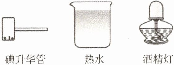 9. 科技应用 小林用如图的一些实验器材做碘升华的实验,实验前他查阅了一些资料如下:标准大气压下,碘的熔点$114^{\circ}C$,碘的沸点$184^{\circ}C$,水的沸点$100^{\circ}C$,酒精灯火焰约$500^{\circ}C$。根据这些资料分析,小林应选______给碘升华管加热,因为________________________而导致碘不能熔化,才能出现固态碘直接变成碘蒸气的现象。