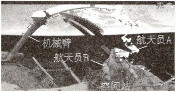 8. 2024 年 5 月 28 日,神舟十八号航天员圆满完成出舱任务。如图,搭乘机械臂的航天员 A 已为空间站安装好空间碎片防护装置,航天员 B 正在出舱。以空间站为参照物,安装好的防护装置是
