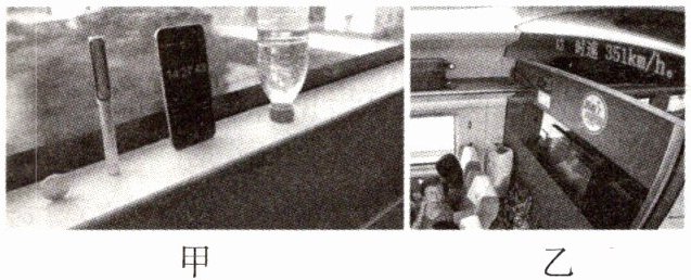 高铁,这张靓丽的国家“名片”,不仅是我国社会经济发展的基础,更成为了增进国家间交流的重要纽带。我国自主创新研发的“复兴号”带来了前所未有的发展机遇,中国高铁正在用创新和突破引领“中国速度”。“复兴号”动车组以 350 km/h 的速度运行,标志着我国成为世界上高铁商业运营速度最高的国家。为了测试“复兴号”高速运行时的稳定性,乘客小全在窗边放置了一些随身物品,如图甲所示,观察到这些物品在如图乙所示的速度下运行时依然“纹丝不动”。