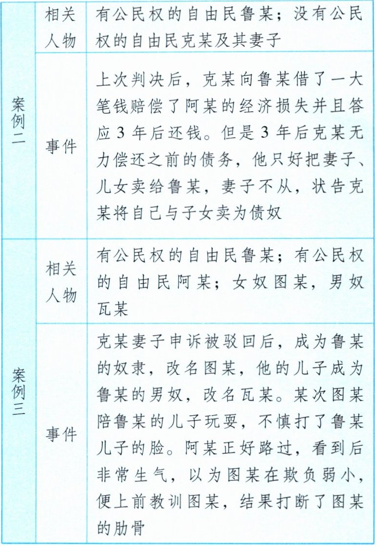 |案例二|有公民权的自由民鲁某;没有公民权的自由民克某及其妻子|上次判决后,克某向鲁某借了一大笔钱赔偿了阿某的经济损失并且答应3年后还钱。但是3年后克某无力偿还之前的债务,他只好把妻子、儿女卖给鲁某,妻子不从,状告克某将自己与子女卖为债奴|
