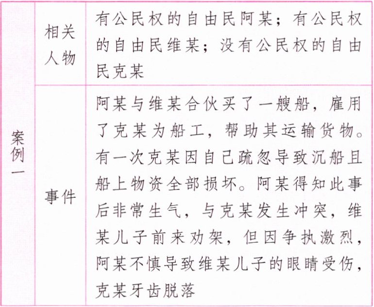 |案例一|有公民权的自由民阿某;有公民权的自由民维某;没有公民权的自由民克某|阿某与维某合伙买了一艘船,雇用了克某为船工,帮助其运输货物。有一次克某因自己疏忽导致沉船且船上物资全部损坏。阿某得知此事后非常生气,与克某发生冲突,维某儿子前来劝架,但因争执激烈,阿某不慎导致维某儿子的眼睛受伤,克某牙齿脱落|
