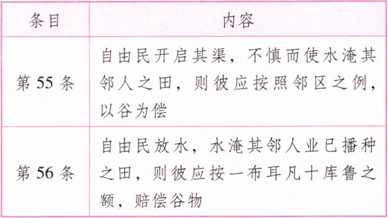 |第55条|自由民开启其渠,不慎而使水淹其邻人之田,则彼应按照邻区之例,以谷为偿|
