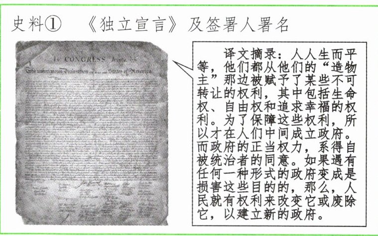 (1)根据材料一,指出《独立宣言》颁布的年份,并概括它所体现的北美民众的诉求。对比史料①和史料②,你认为哪一史料对研究美国独立战争更具有史料价值?