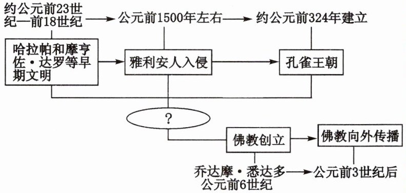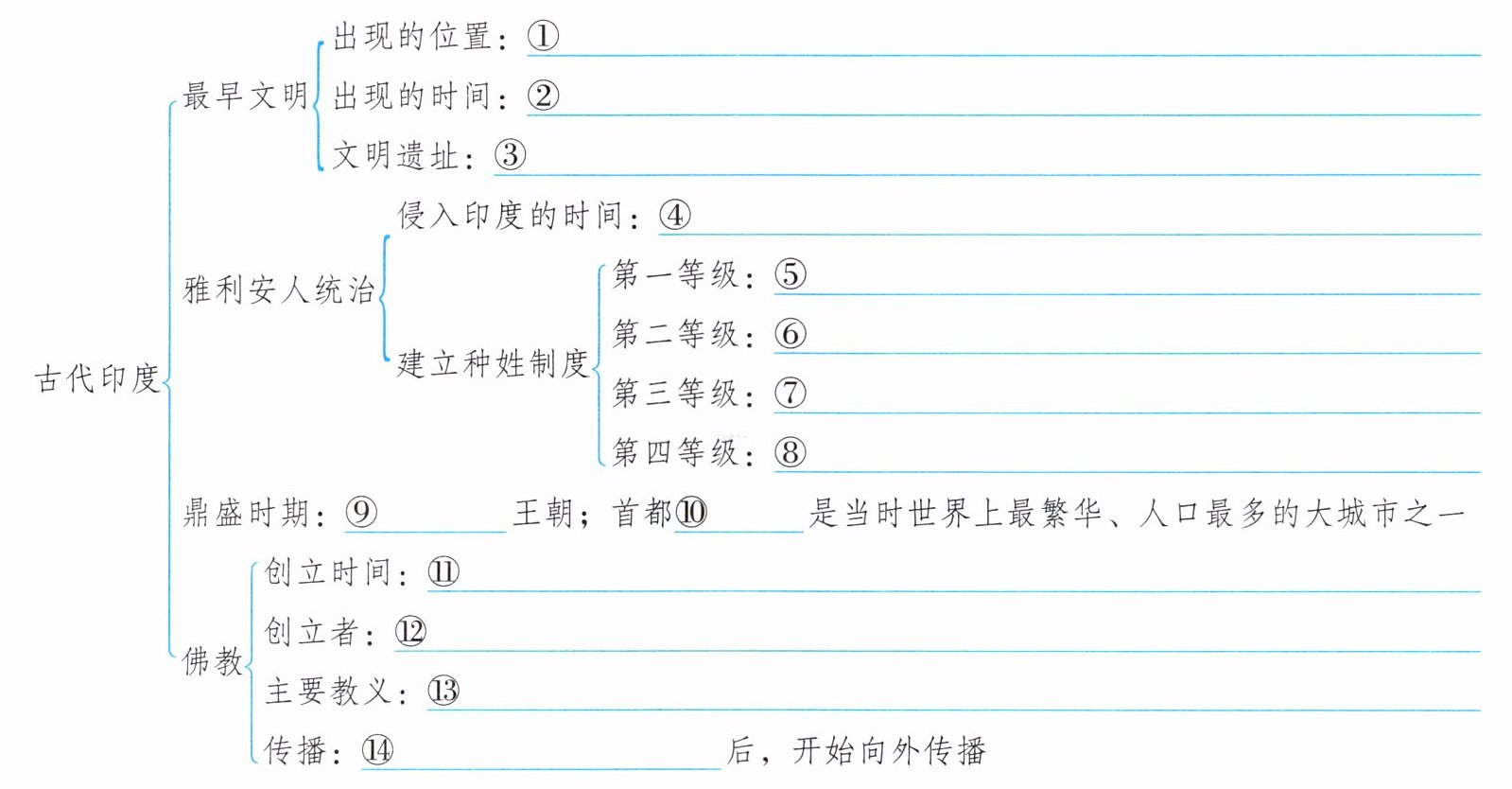 ①南亚印度河流域 ②约公元前23世纪—前18世纪 ③哈拉帕、摩亨佐·达罗等 ④公元前1500年左右 ⑤婆罗门 ⑥刹帝利 ⑦吠舍 ⑧首陀罗 ⑨孔雀 ⑩华氏城 ⑪公元前6世纪 ⑫乔达摩·悉达多 ⑬“众生平等”“忍耐顺从” ⑭公元前3世纪