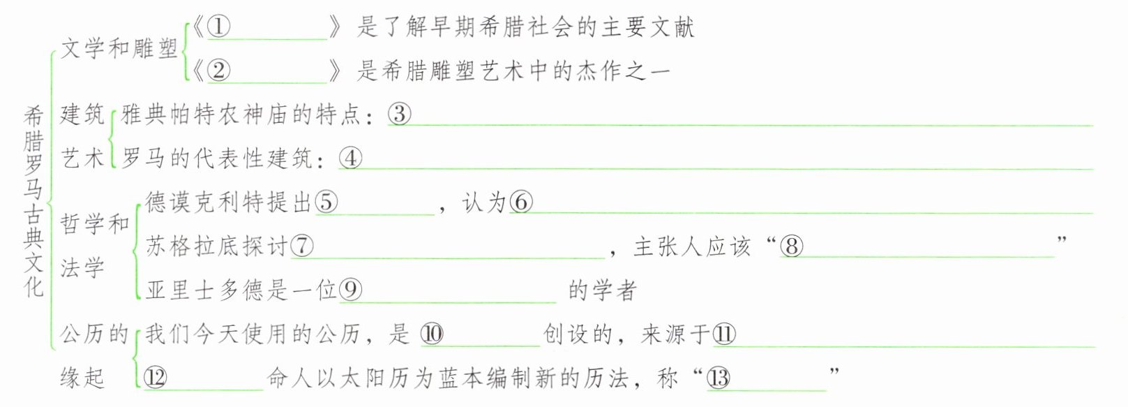 ①荷马史诗 ②掷铁饼者 ③四周以廊柱环绕,柱身有粗有细 ④大竞技场、引水道工程、凯旋门和万神庙 ⑤“原子论” ⑥宇宙万物是由微小的“原子”组成的 ⑦人的灵魂、美德和幸福等问题 ⑧认识你自己 ⑨百科全书式 ⑩罗马人 ⑪古埃及人的太阳历 ⑫凯撒 ⑬儒略历