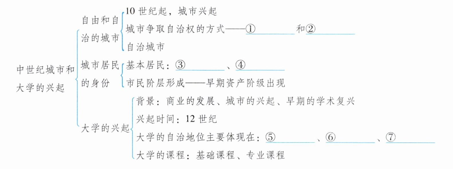 |中世纪城市和大学的兴起|自由和自治的城市|10 世纪起,城市兴起城市争取自治权的方式——①____和②____自治城市|