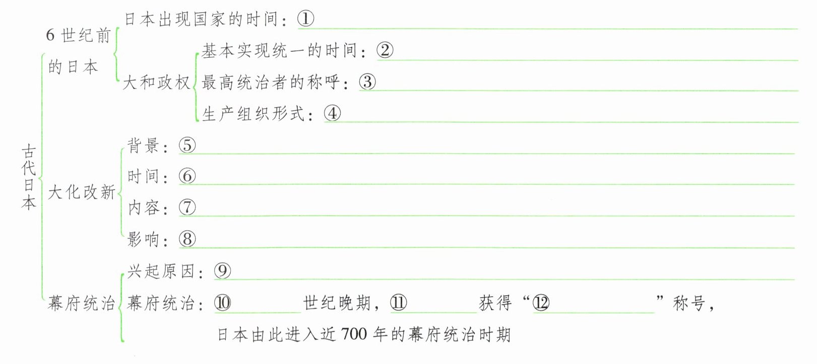 ①1—2世纪 ②5世纪 ③大王 ④以“部”的形式 ⑤6—9世纪,中国文化直接影响着日本;皇族中的改革派发动宫廷政变,孝德天皇即位 ⑥从646年开始 ⑦政治上,建立以天皇为中心的中央集权制度,地方设国、郡、里三级,由中央派官治理。经济上,废除一切私地、私民,将土地、部民收归国有,成为公地、公民;国家将土地分给公民,每隔六年授田一次,不能自由买卖;统一赋税 ⑧使日本发展成为一个中央集权制的封建国家 ⑨大化改新百余年后,地方豪强势力不断壮大,为了保护自己的庄园,组织武装力量,形成武士 ⑩12 ⑪源赖朝 ⑫征夷大将军
