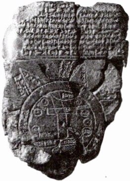 1. 右图是约公元前600年的泥版地图:地球以一个小圆盘的形象出现,四周为一圈水,邻近地球中心的一个矩形小方框横跨幼发拉底河,周围小圆圈代表邻近的城市。地图中的矩形小方框代表的可能是( )