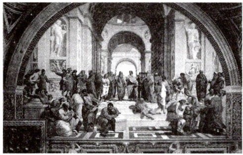 4. 如图是拉斐尔创作的《雅典学派》,以古希腊哲学家柏拉图所建的雅典学园为题,表现人类对智慧和真理的追求。画面上来自希腊、罗马和斯巴达的学者聚集一堂,以柏拉图(左)和亚里士多德(右)为中心而展开学术讨论。其中有数学家毕达哥拉斯,学者阿基米德、赫拉克利特、阿维洛依,语法学家伊壁鸠鲁,哲学家苏格拉底、第欧根尼,天文学家托勒密等,甚至还有画家拉斐尔本人。该作品( )