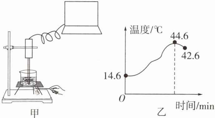 11. 如图甲所示,小明用该装置粗测花生米的热值,过程如下:用电子秤取30g水放入烧杯中,将温度传感器插入水中,并连接电脑;取0.7g花生米穿在细铁丝上,点燃花生米,立即移到烧杯正下方,给水加热,传感器获得温度—时间的图像如图乙所示。$[c_{水}=4.2×10^{3}J/(kg\cdot^{\circ}C)]$