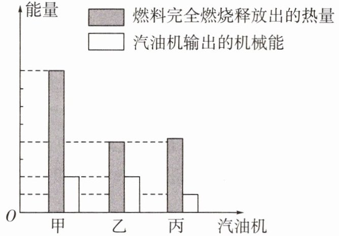 9. 如图所示为甲、乙、丙三台使用不同燃料的热机完全燃烧1kg燃料所释放的内能和热机输出机械能的二维柱状图。三台热机的转速和效率始终保持不变。根据图中的信息,下列选项正确的是(