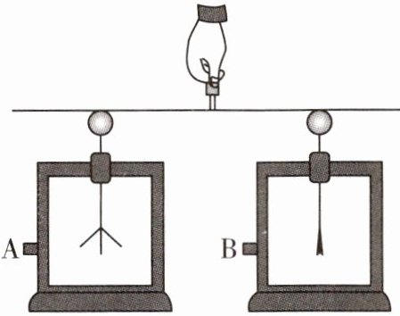 12. 如图所示,取两个相同的验电器 $ A $ 和 $ B $,使 $ A $ 带负电,$ B $ 不带电,用带有绝缘手柄的金属棒把 $ A $ 和 $ B $ 连接起来。下列说法正确的是(