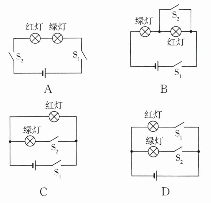 8. 现代社会倡导文明出行,晓民同学观察人行横道信号灯,发现人行横道信号灯由红灯和绿灯组成,红灯停,绿灯行。以下画出的是控制人行横道红、绿灯的模拟电路图,你认为可行的是(