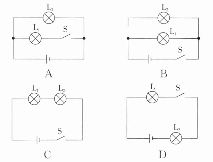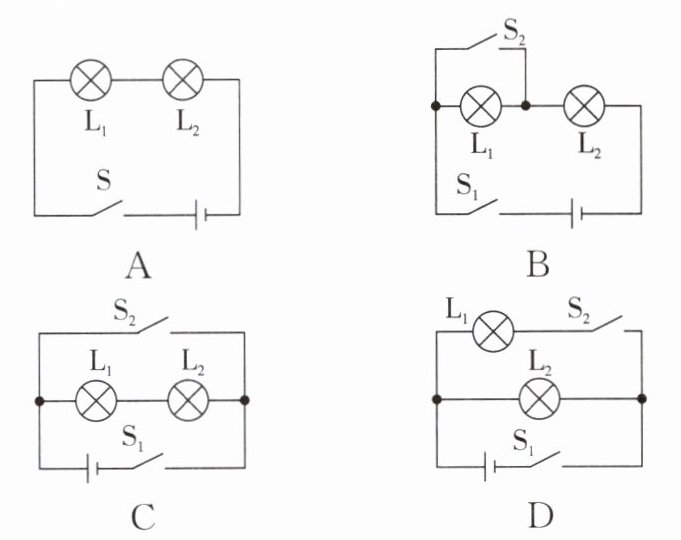 5. 小谢在做实验时,先连成如图所示的电路,闭合开关 $ S_1 $ 并观察灯泡亮暗情况后,再闭合开关 $ S_2 $,小谢看到的现象是(