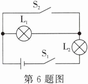 6. 如图所示的电路中,当开关 $ S_1 $、$ S_2 $ 都闭合时,亮着的灯是 $ L_2 $;当开关 $ S_1 $ 闭合、$ S_2 $ 断开时,亮着的灯是