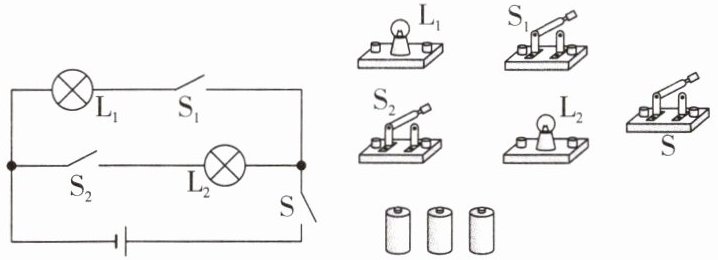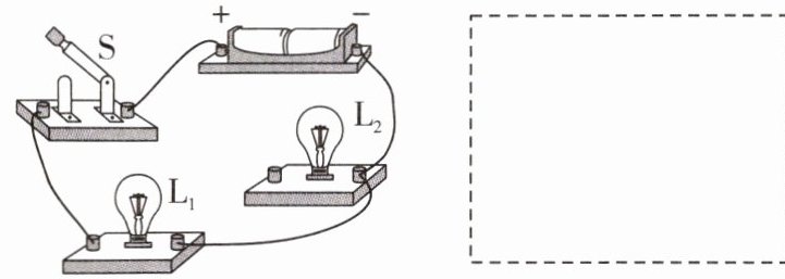 13. 教材改编(1)用笔画线代替导线,把实物电路补充完整,要求使小灯泡 $ L_1 $、$ L_2 $ 并联,开关控制两个灯泡,导线不能交叉;