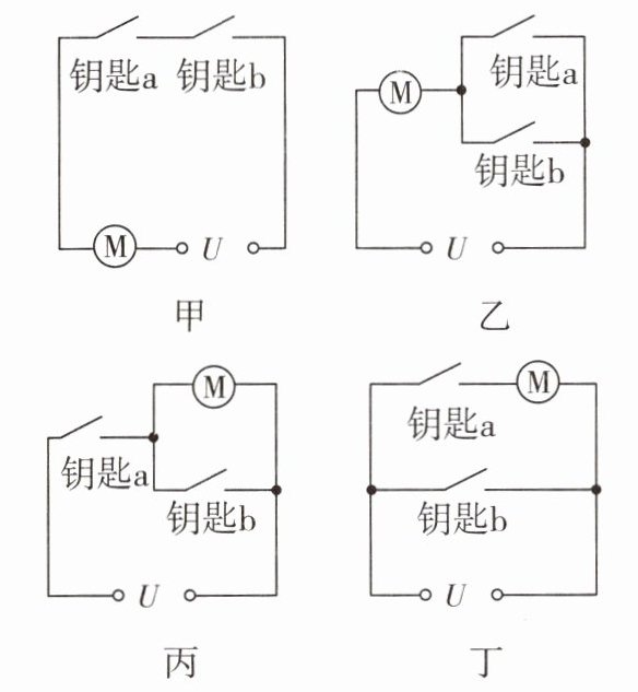 12. 情境应用 某仓库的大门由两把不同的钥匙控制电动机开启,小壮设计了如图所示的四种电路。其中单把钥匙无法打开,只能两把钥匙同时使用才能打开的电路是