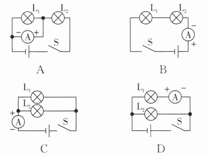 5. 在如图所示电路中,开关S闭合后,能正确测出通过灯L₁中电流的是 (