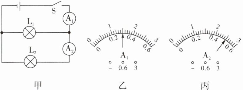 10. 如图甲所示电路,$ L_1 $和$ L_2 $之间是并联的,闭合开关S,电流表$ A_1 $、$ A_2 $的示数如图乙、丙所示,则电流表$ A_1 $的示数是