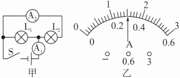 4. 如图甲所示的电路,闭合开关S后,两个灯泡都能发光,乙图为电流表$ A_1 $指针的位置,如果电流表$ A_2 $读数是0.6A,下列说法正确的是