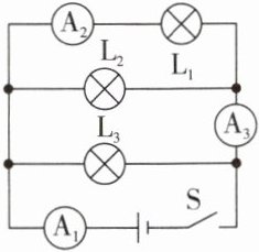 5. 在如图所示电路中,闭合开关S,电流表$ A_1 $、$ A_2 $、$ A_3 $的示数分别为$ I_1 $、$ I_2 $、$ I_3 $,它们的大小关系正确的是 (
