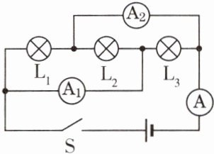 13. 如图所示的电路中,开关S闭合后电流表A的示数为1.5A,电流表$ A_1 $的示数为0.8A,电流表$ A_2 $的示数为1.2A,则通过$ L_2 $的电流为