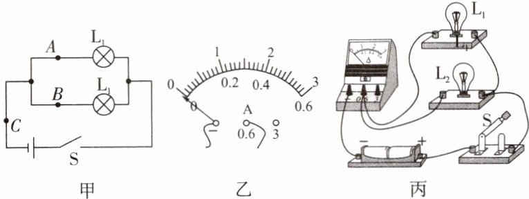 (1)图甲是他们设计的电路图,图丙是他们测量电流时连接的实验电路,此时电流表测量的是______(选填“A”“B”或“C”)处的电流。连好电路闭合开关前,发现电流表指针位置如图乙所示,原因是________________。正确调整后闭合开关,发现指针又偏向图乙位置,其原因是______________________________;