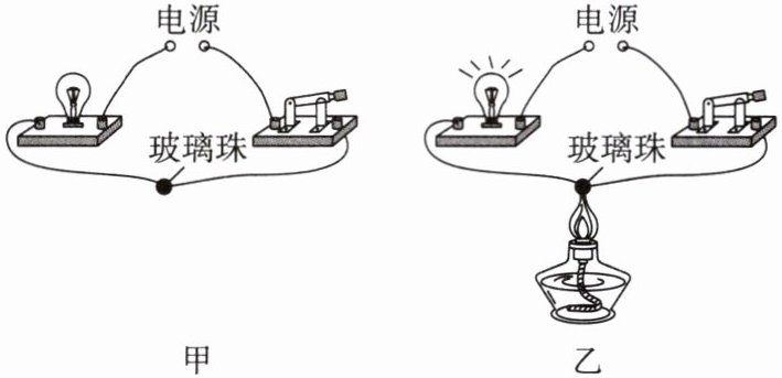 5. 如图甲所示,把玻璃珠接入电路中,闭合开关,发现小灯泡不发光,说明________________;给玻璃珠加热,如图乙所示,当玻璃珠加热到红炽状态时,发现小灯泡发光,说明______________________________。