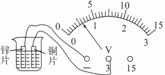 9. 教材改编 如图所示,在烧杯中加入盐水,然后将连在电压表上的铜片和锌片插入盐水中,这样就制成了一个盐水电池。观察电压表的接线和指针偏转情况可知:锌片是盐水电池的